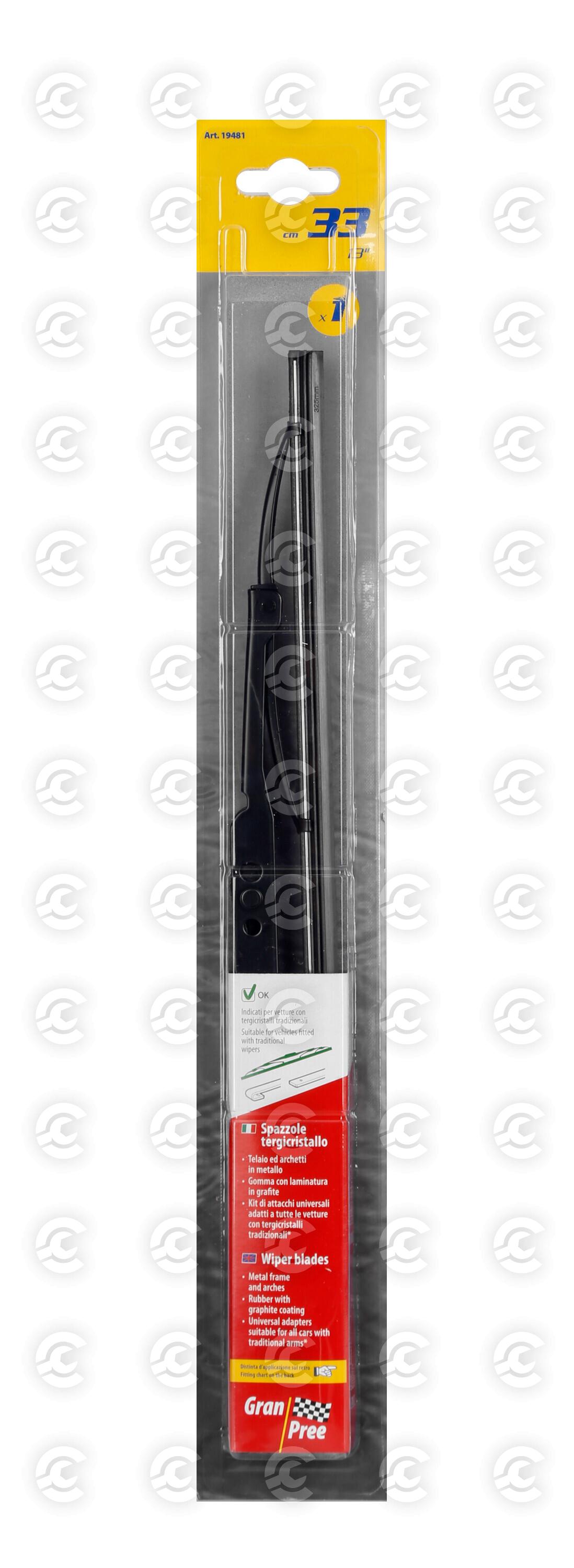 Telaio ed archetti in metallo. Gomma con laminatura in grafite. Kit di attacchi universali adatti a tutte le vetture con tergicristalli tradizionali