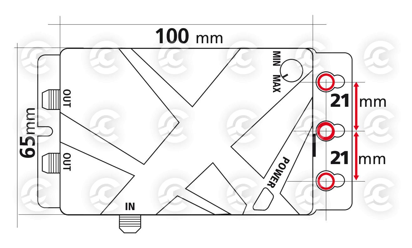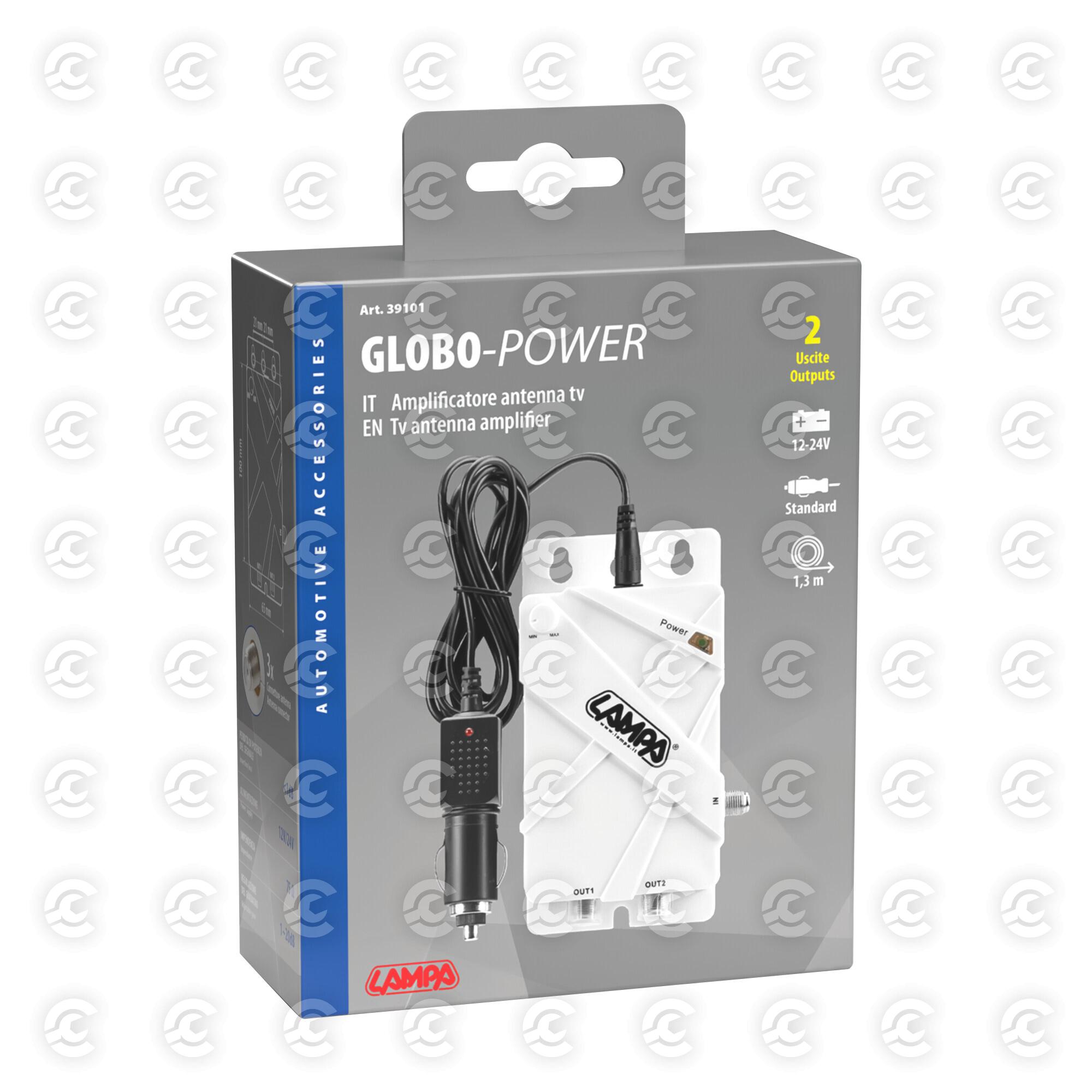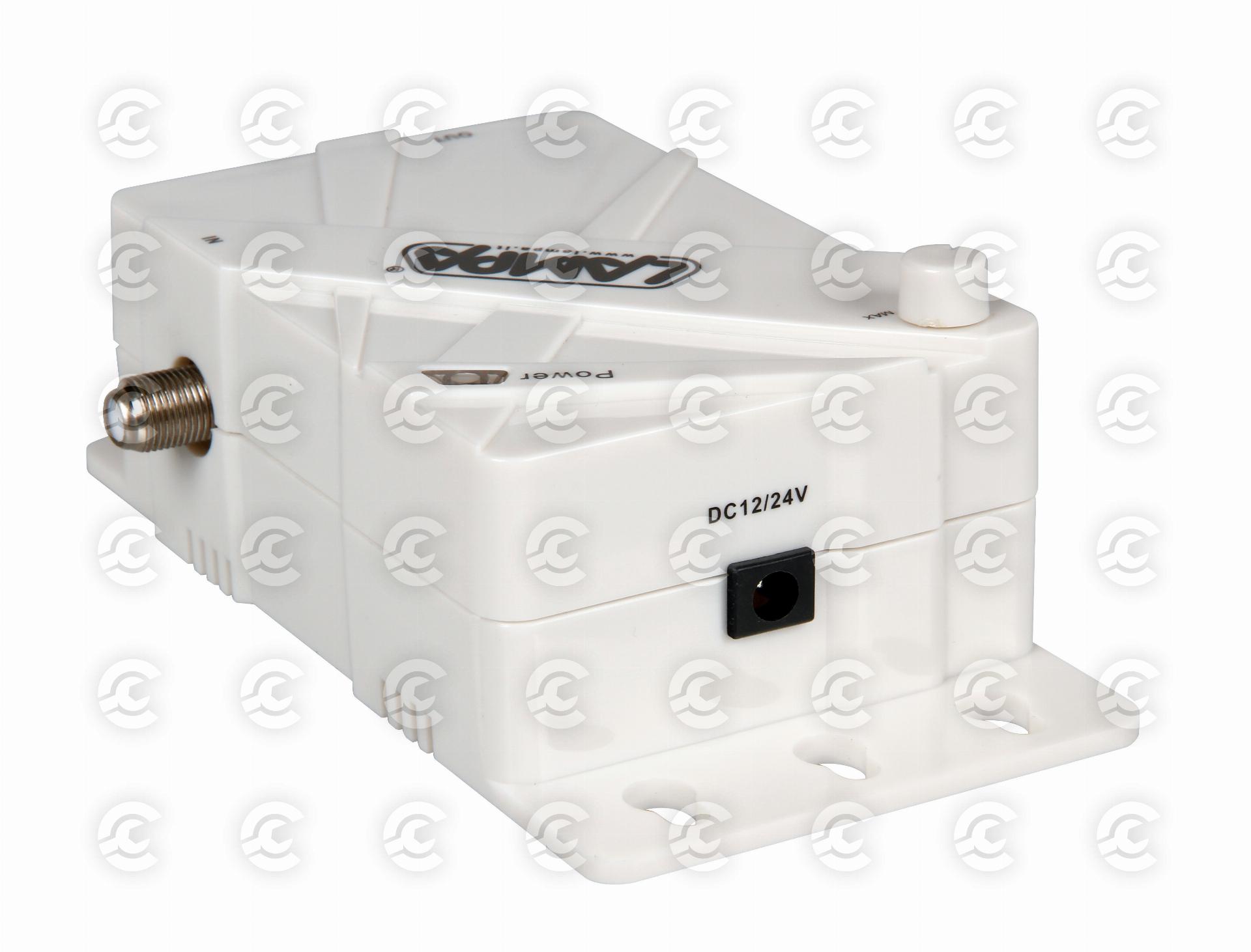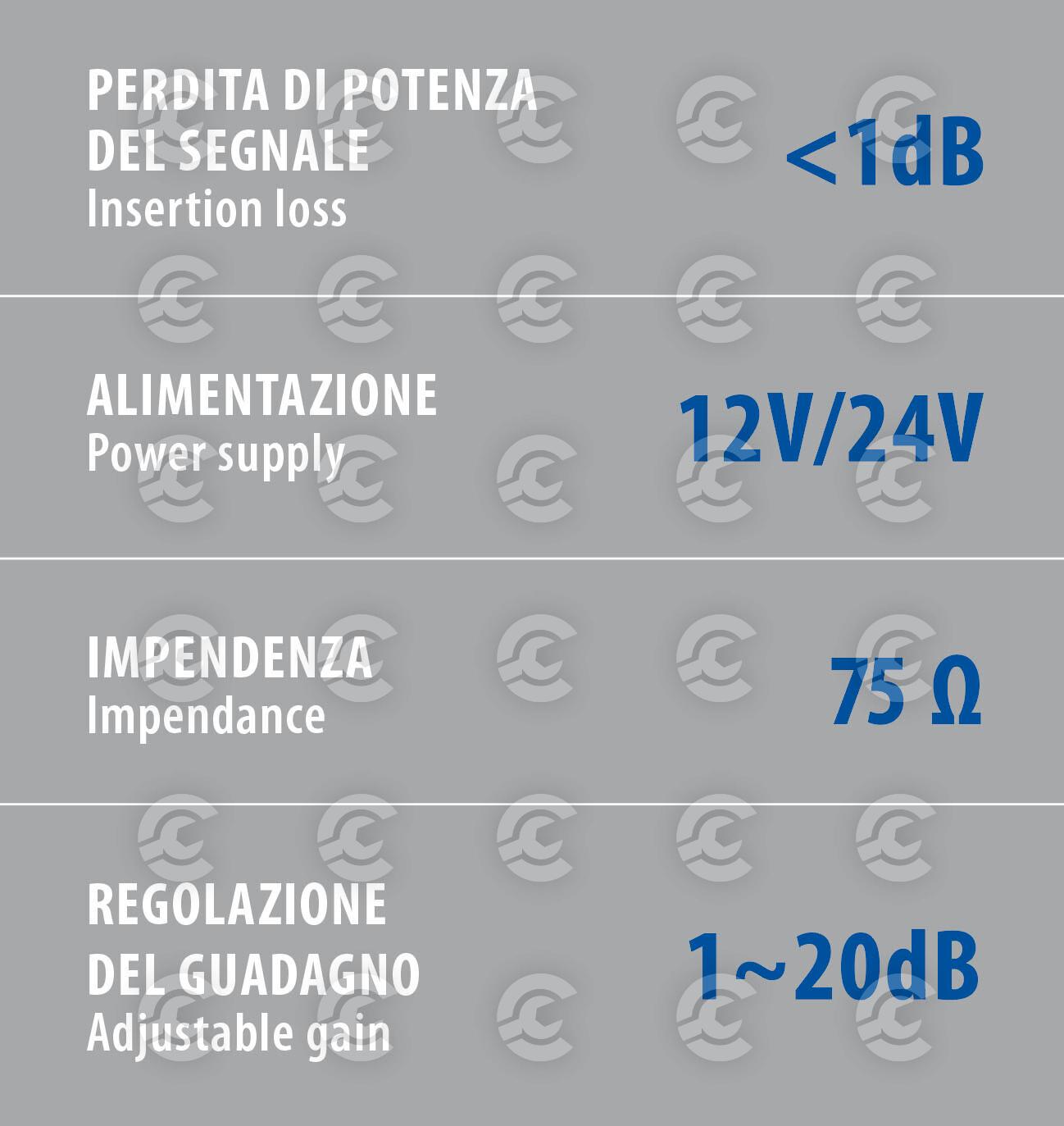 Con regolazione del guadagno. Alimentazione tramite spinotto accendisigari con cavo da 1,3 m. Viti per il montaggio incluse