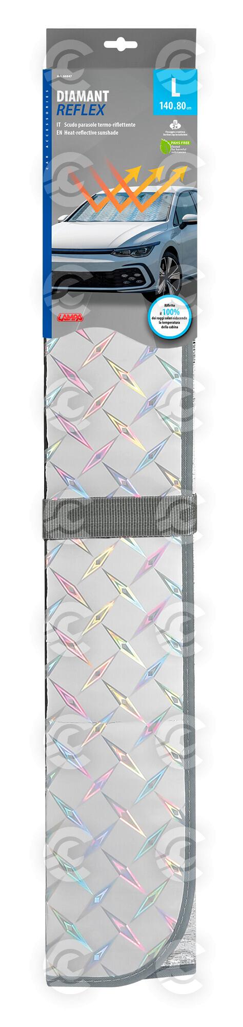 Multi-strato termo riflettente. Un lato in cartoncino con laminatura in poliestere oleografico metallizzato. Isolamento centrale in schiuma atermica da 3 mm. Laminatura interna in poliestere metallizzato. Si fissa abbassando le alette parasole