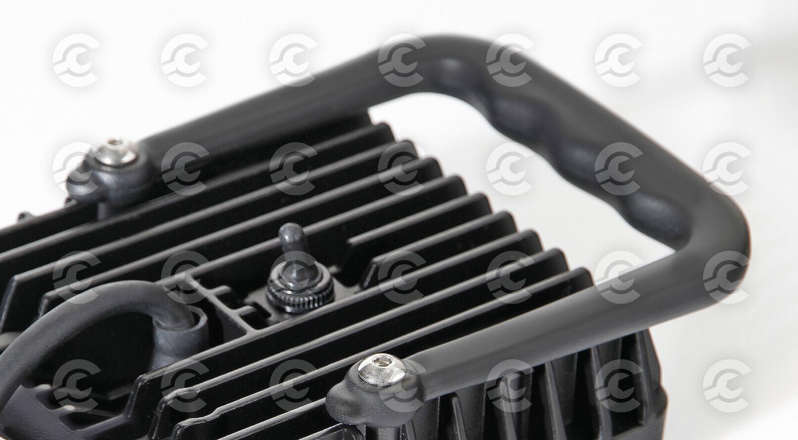 Struttura in alluminio, impermeabile IP67. Staffa in acciaio completa di viti per il fissaggio. Con maniglia e interruttore on/off.