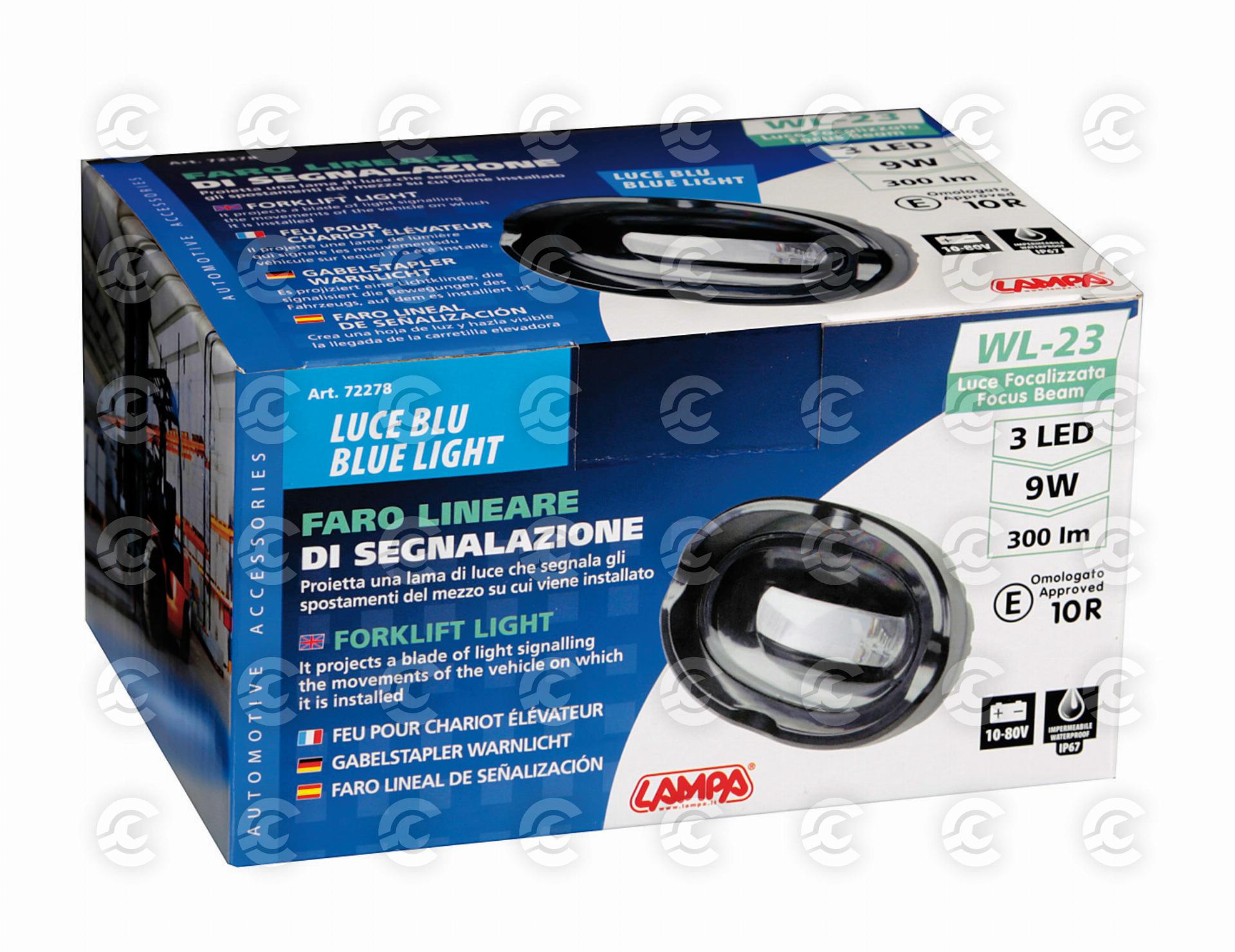 Struttura in alluminio, lente in PMMA, impermeabile IP67. Staffa in acciaio completa di viti per il fissaggio. Luce focalizzata multivoltaggio da 9W, 300 lumen. Particolarmente indicato per muletti